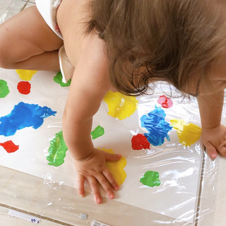 Sugestão para filhos mais velho que já fiquem em pé, é colar a folha no vidro, à altura do bebe.